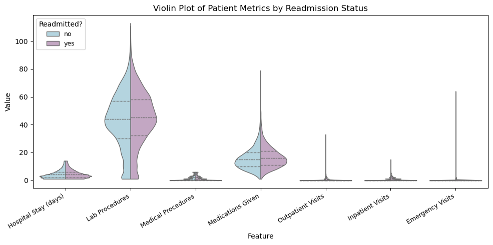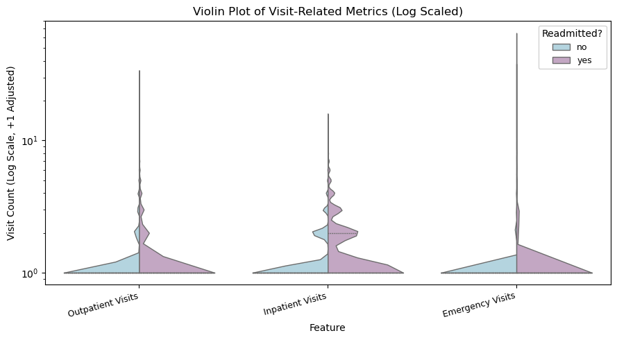 Key Finding: The full violin plot shows that most hospital-related measurements in the dataset are highly right skewed, meaning the majority of patients use only a small amount of medical resources while a smaller subset requires substantially more, with readmitted patients appearing more frequently in those higher-value ranges. Because three of the variables (outpatient, inpatient, and emergency visits) operate on a much smaller scale and were visually compressed in the full plot, a separate log-scaled violin chart was created, revealing more detailed variation and showing that patients with higher visit frequency, especially before hospitalization, are more likely to be readmitted, suggesting prior care utilization may be an early indicator of clinical instability.
